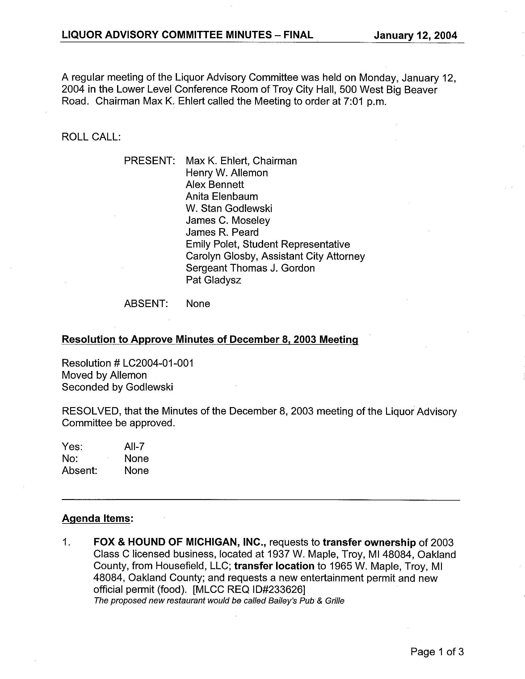2004 01 12 Liquor Advisory Committee Regular City Of Troy Michigan